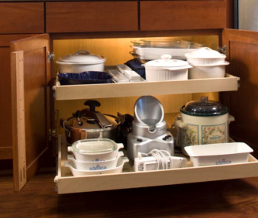 6. Запеканки и мелкая бытовая техника. Эти предметы лучше всего хранить в шкафах с выдвижными полками для более легкого доступа. Еще один вариант — контейнеры Tupperware. Если у вас есть угловой шкаф или шкаф с вращающейся полкой, используйте его для более тяжелых предметов, таких как мелкая бытовая техника — легкие предметы, как правило, застревают и падают повсюду. Контейнеры Tupperware лучше всего хранить в ящиках. (Вы когда-нибудь открывали настенный шкаф, и он опрокидывался вам на голову? Вот именно).