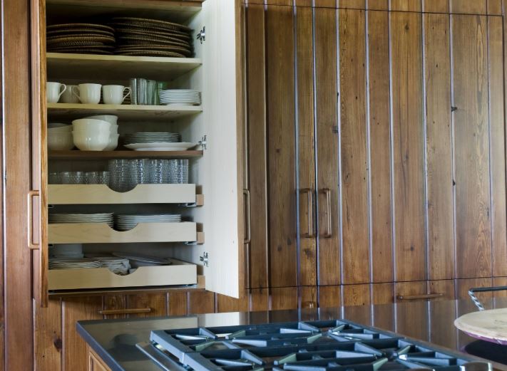 Если у вас нет настенных шкафов, но много высоких полок для хранения, используйте вместо них кухонный шкаф-кладовку для посуды. Ещё одна идея: если у вас ограниченное количество настенных и высоких шкафов, поищите высокий буфет или шкаф со стеклянными дверцами и поставьте его на голую стену. Хотя он может быть не самым удобным местом в центре рабочего треугольника, он выглядит отлично, а несколько дополнительных шагов для уборки посуды — это небольшая плата за место для хранения и стиль. Вставки для выдвижных ящиков — отличный вариант для кухонь с ограниченным пространством для хранения в настенных шкафах. Эти подставки подходят для шкафов разных размеров, и вы можете взять сразу целую стопку тарелок, чтобы накрыть на стол.