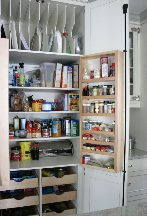 7. Сухие продукты и кладовая. Не разбрасывайте их по настенным шкафам только потому, что у вас пустые шкафы! Ходить по кухне, открывая дверцы в поисках того, чего не можешь найти, — одна из самых раздражающих и неприятных вещей, которая часто отбивает желание готовить. Редко используемые специи и соусы можно хранить в кладовой, а те, которые вы используете чаще, поставьте поближе к плите. Если вы пекарь и у вас есть место, выделите отдельное место для ингредиентов для выпечки, таких как сахар, мука и т. д. У меня есть клиентка, у которой есть настоящий ящик для специй!