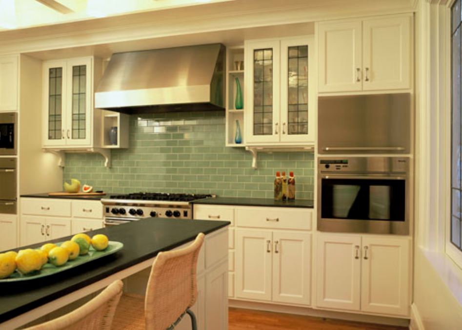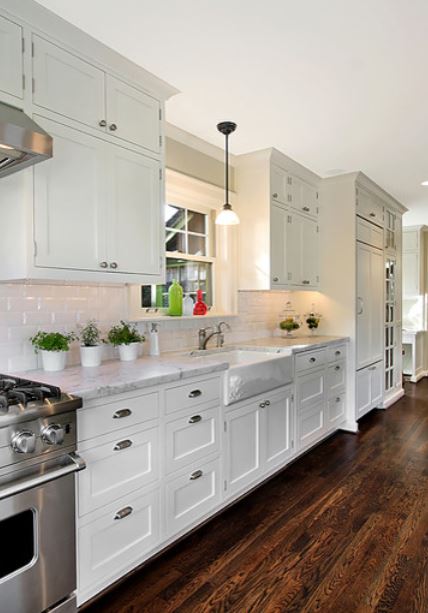5. Масла, уксусы и высокие баночки со специями. Представьте, что вы готовите на своей кухне. Масла, уксусы и продукты в высоких баночках со специями, соль, приправы, соусы и т. д. удобно хранить в одном шкафу слева или справа от плиты. Вам ведь не захочется каждый раз ходить в кладовку за этими продуктами. Если у вас есть шкафы между раковиной и плитой, как показано здесь, высокие баночки со специями, маслами и уксусами идеально подойдут для самого дальнего настенного шкафа справа.