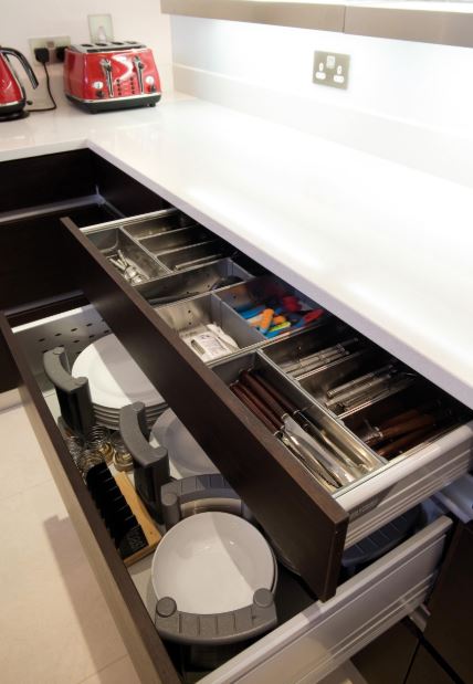 Несмотря на то, что слева от этой посудомоечной машины есть выдвижной ящик , я бы не стала использовать его для столовых приборов, потому что до них будет трудно добраться, когда посудомоечная машина открыта. Я бы выбрала ящик справа от раковины, хотя он и находится немного дальше.