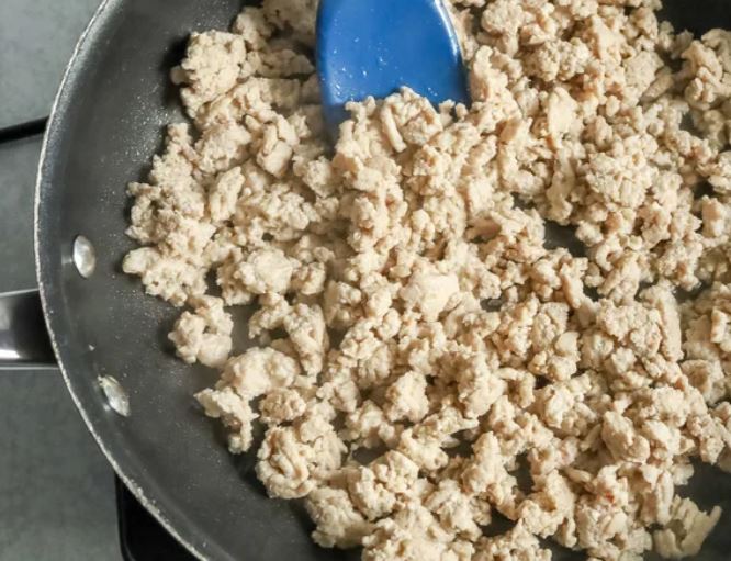 В большой сковороде на среднем огне обжарьте куриный фарш, разбивая его лопаткой по мере подрумянивания.