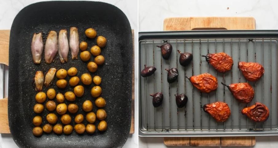Вымойте мелкий картофель и разрежьте пополам. Очистите три луковицы шалота и разрежьте вдоль пополам. Разрежьте три груши пополам и удалите сердцевину ложкой или срежьте ножом для чистки овощей. Разрежьте инжир пополам вдоль плодоножки. Смажьте форму для запекания рапсовым маслом или другим маслом с высокой температурой дымления и выложите картофель, лук-шалот, инжир и груши.