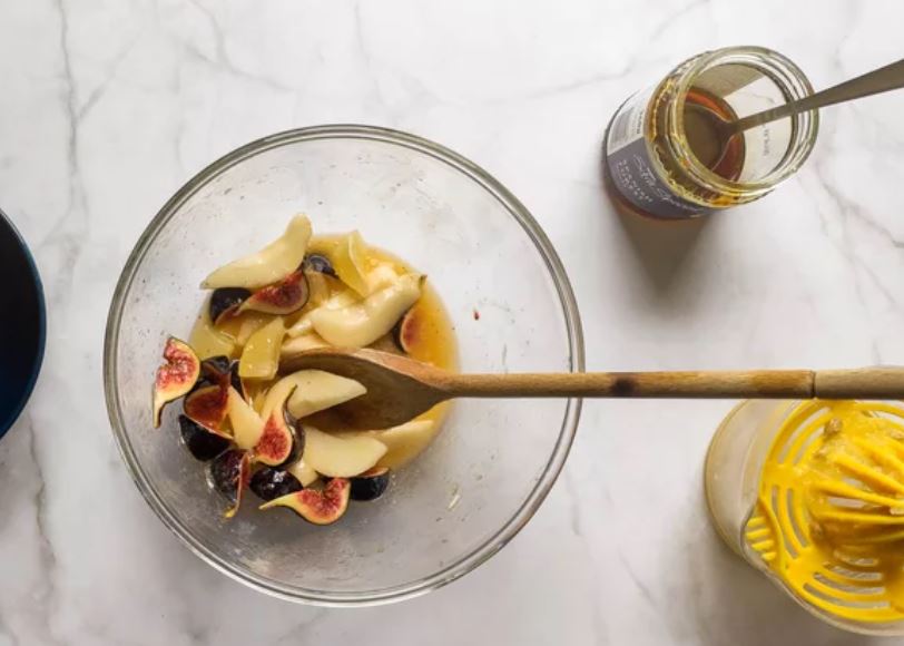 Используйте лимоны в своем рецепте: сок из них идет на глазурь, а сами лимоны — в начинку для утки. Растопите две столовые ложки сливочного масла в миске среднего размера, которую можно использовать в микроволновой печи. Добавьте сок полутора лимонов и одну столовую ложку меда и перемешайте до получения однородной массы. Нарежьте три инжира, одну или две груши сорта Бартлетт (в зависимости от размера) и половину лимона на четвертинки. Добавьте их в масляную смесь и отставьте миску в сторону.