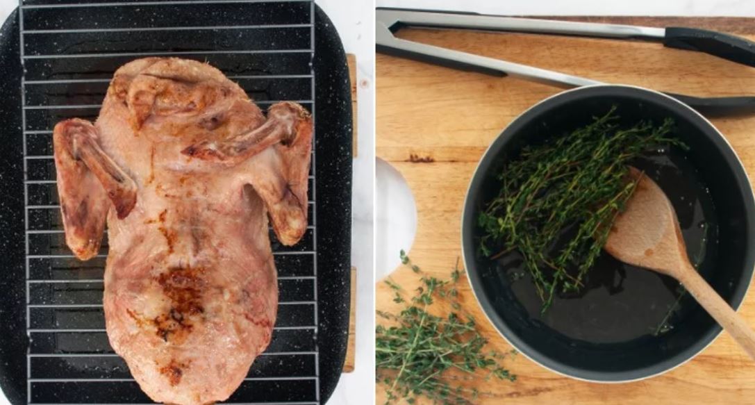 Пока утка запекается, можно приготовить глазурь. Смешайте в кастрюле сок двух лимонов, четыре столовые ложки меда и горсть свежего тимьяна. Нагревайте на среднем огне, пока тимьян не станет коричневым. Достаньте веточки тимьяна и выбросьте. Убавьте огонь и варите глазурь, пока она не начнет густеть. Снимите кастрюлю с огня и отставьте в сторону.