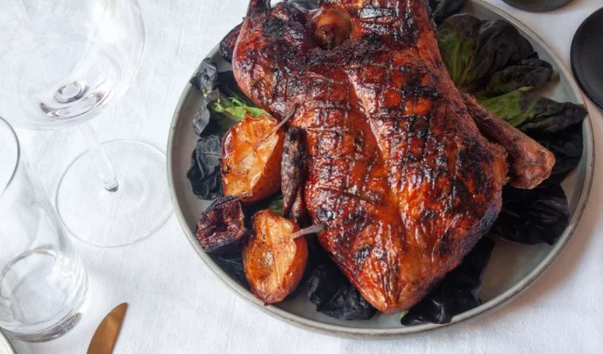 К этому моменту утка должна приобрести красивый золотистый цвет, но чтобы кожа стала блестящей и хрустящей, ей нужно еще 15 минут. Смажьте утку со всех сторон лимонно-медово-тимьяновой глазурью. Увеличьте температуру в духовке до 245 °C и снова поставьте утку в духовку. Запекайте утку 15 минут, но не отходите от нее, так как мед в глазури может легко подгореть.